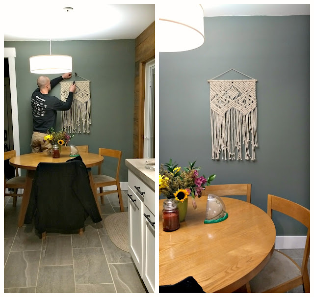 I found a macrame wall hanging at a local store for a really good price–and I just loved it. It looks perfect against the dark green walls in our kitchen. It won’t stay there forever (hopefully one day there will be a barn door on that wall) but for now, with one small nail hole, I just grin every time I walk by. It makes me happy.
